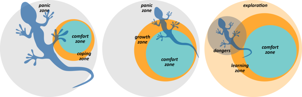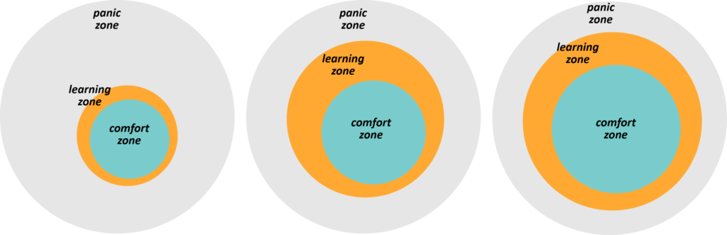 Auch wenn die wissenschaftliche Basis dünn ist, können die meisten von uns das Komfort-Zonen-Modell fühlen. Es gibt verschiedene Varianten, die im Netz und Literatur kursieren, ich nehme hier die Variante mit der Komfort-Zone, der Lern-Zone und dem Bereich der Panik danach.